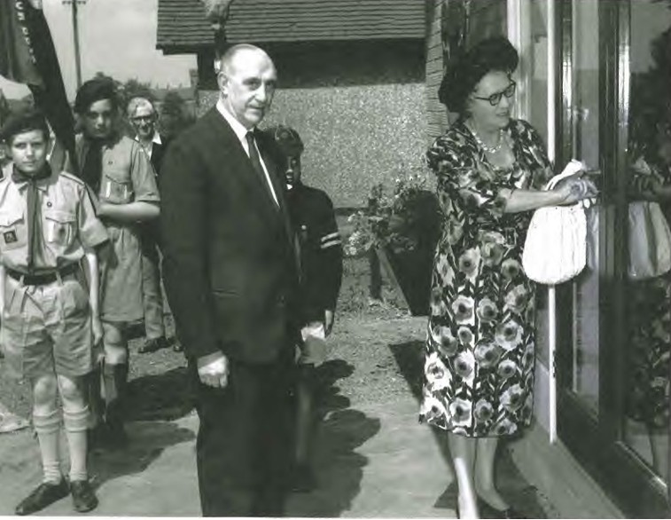 A photo exists of Mrs May Oates (Mr Wallace’s daughter) and Leslie Sell unlocking the hut, with the lads and parents looking on (see Figure below). One final twist: the District Commissioner refused to travel from Aylesbury to Edlesborough ̶ he said it was too far ̶ and the D. C. from Bedfordshire would only come if the Group was renamed Eaton Bray and Edlesborough, because Eaton Bray was in Bedfordshire!! Politics!! Figure: The H. Q. was opened by Mrs May Oates, Wallace’s daughter, and Mr Leslie Sell. Mr Peter Powell, son of B. P., planted the Silver Birch.