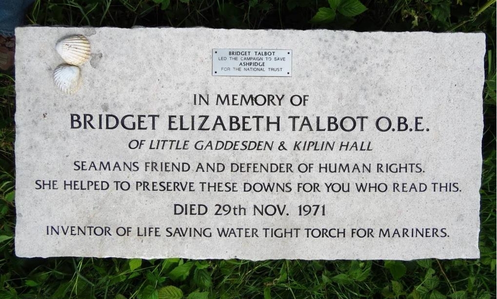 Bridget Talbot was born and brought up in Little Gaddesden, the niece of Lord Brownlow. Throughout her life she had connections and links with Edlesborough. When she died her ashes were scattered, at her request, 'over the little stream off the grass road between Edlesborough and Ivinghoe, in view of the nine miles stretch of wood and country, and a stone put up. ..... To say that I saved them for the National Trust.' In due course this memorial bench was put up by her Trustees to mark the spot.